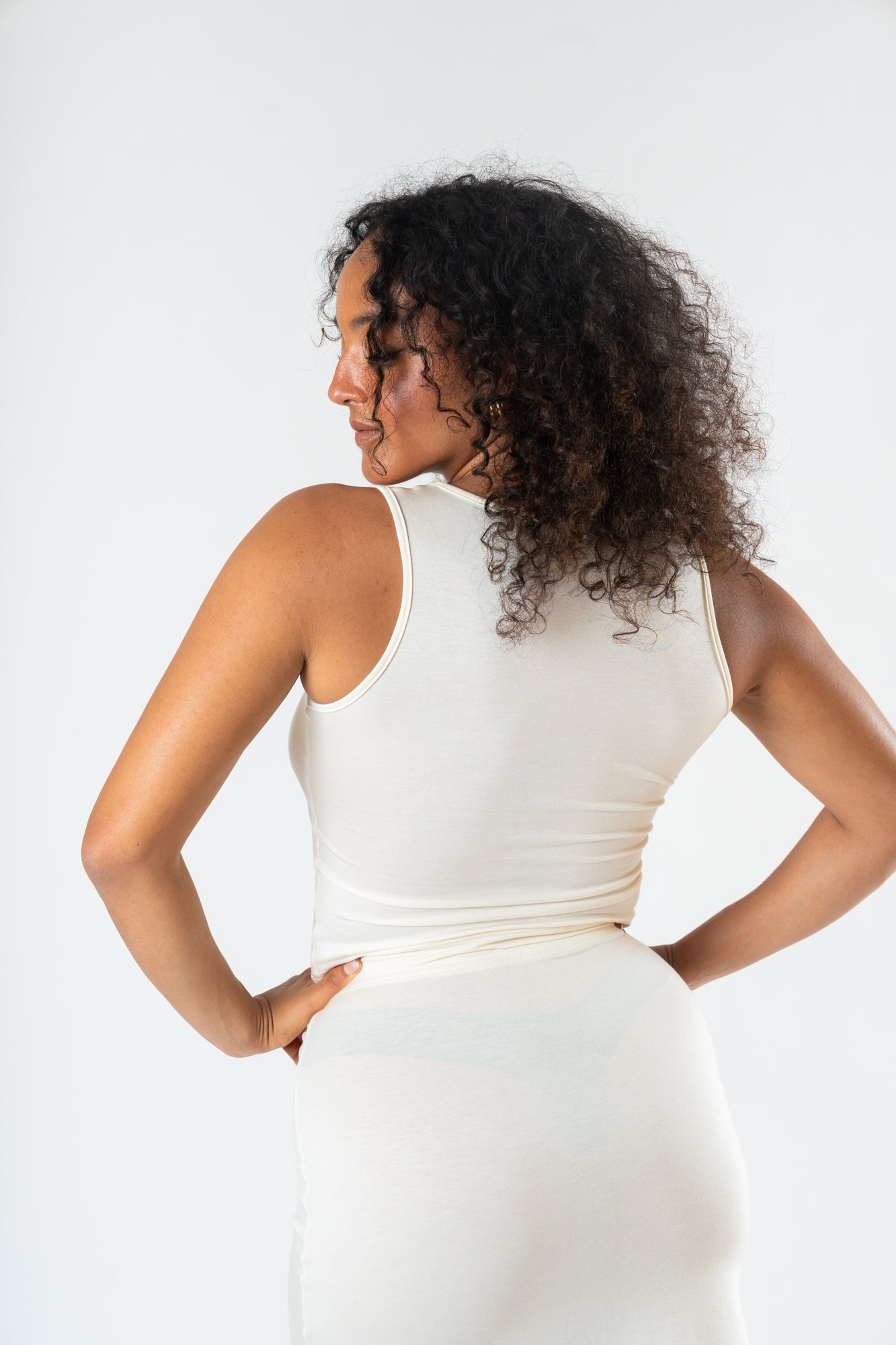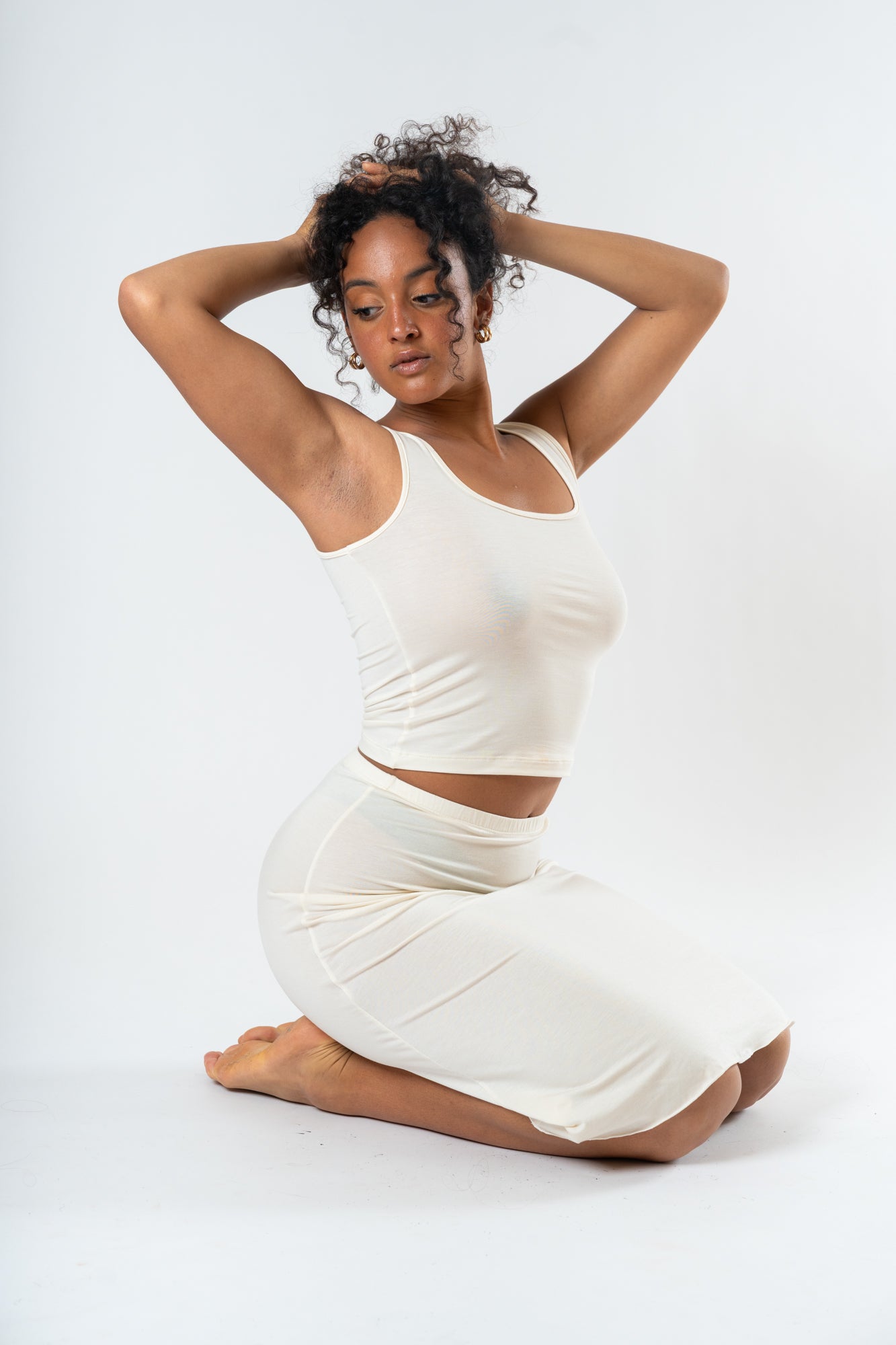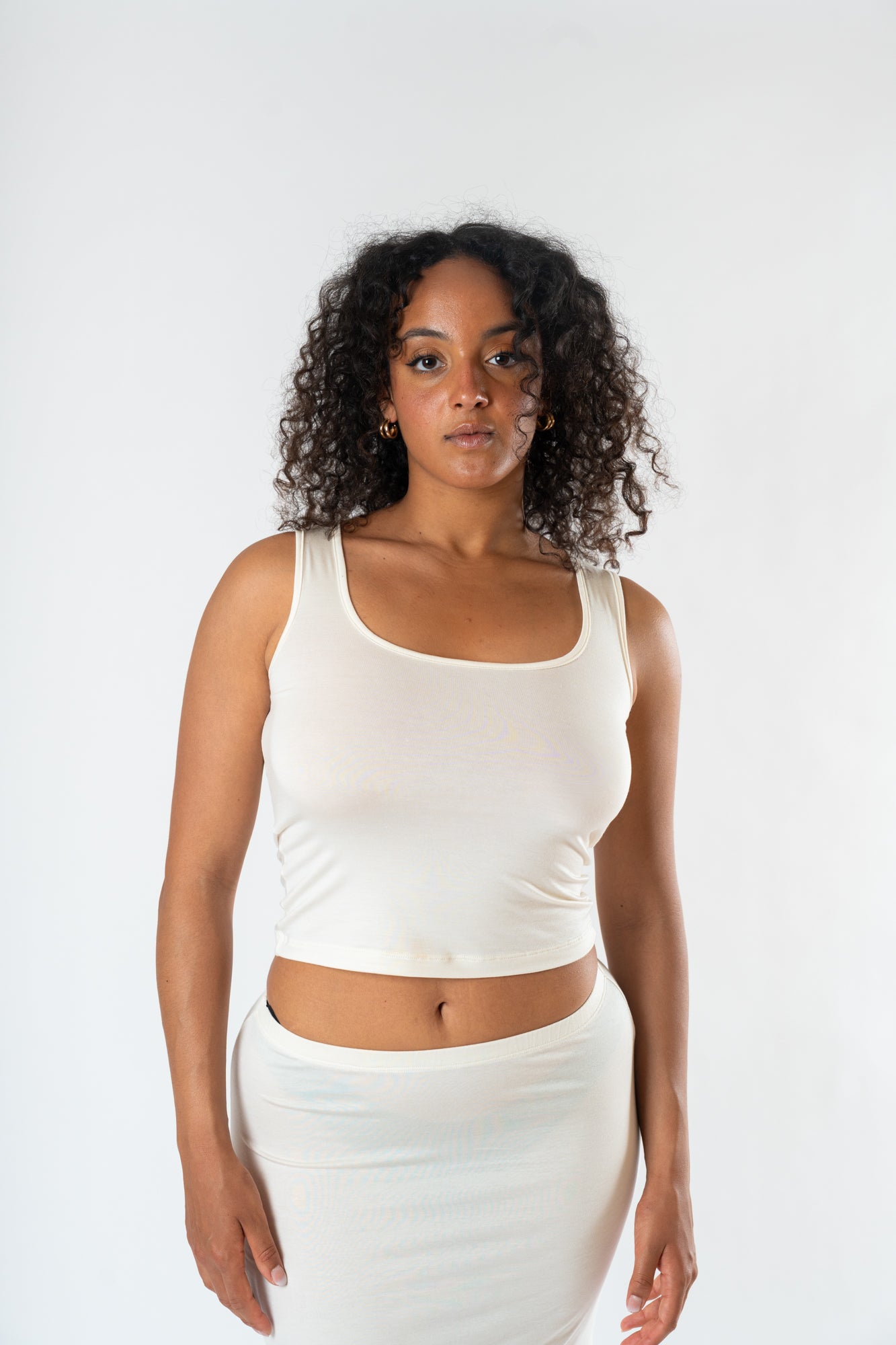 Versatilità: Minimal, fresco, essenziale. Il Top Crop in fibra di Alga è realizzato in un jersey a base di alga marina, una fibra innovativa e sostenibile che garantisce traspirabilità, morbidezza e delicatezza sulla pelle. Il taglio cropped con spallina larga e scollo squadrato valorizza il busto con naturalezza, adattandosi a ogni corpo con grazia e semplicità.